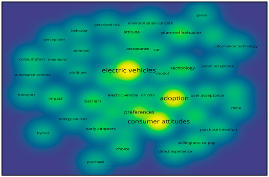 This density map shows that the keyword “electric vehicles” appears with the highest density, further confirming the dominance seen in the previous network map. The density map also visually highlights the areas of greatest interest in research. The yellow areas indicate the highest keyword concentrations, with the highest densities around the keywords “electric vehicles”, “adoption”, and “consumer attitudes”. This is in line with the previous figure, where the keywords displayed were central to the network. Overall, the density map and the network map together provide a comprehensive picture of the current state of the art in the field of alternative fuel vehicle research. The visual representation of the frequency and interconnections of keywords helps to understand research trends, major themes, and their interconnections.