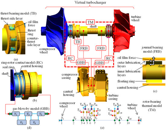 Graphical scheme of the virtual turbocharger as a coupled computational model for the transient solution of rotordynamics using sub-models of the thrust bearing (a) [9], the ring–shaft interaction model (b) and the floating ring journal bearing model (c) [8]. The virtual turbocharger is extended by sub-models including the model of gas dynamics in the sealing system (d) and the rotor bearing thermal model (e).