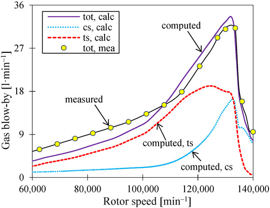 Calculated (calc) total GBB and GBB components on the turbine (ts) and compressor (cs) side of the sealing system depending on the rotor speed. The calculated values are compared with the result of the technical experiment (mea), and the range marked for each measured value expresses the uncertainty of the measurement. The results are presented for the sped-up regime of the ICE with TC.