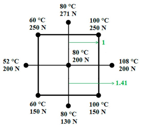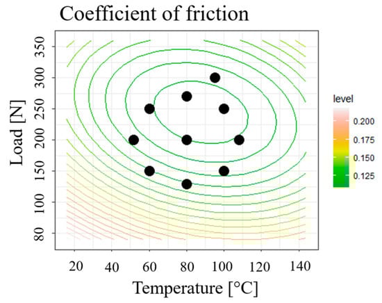 Throughout this research, a central composite circumscribed experimental design methodology (Figure 1) was used to define the tribometer test parameters. This method enabled the investigation of the friction characteristics of the oils and the development of a predictive model that can determine the expected minimal value of coefficient of friction (CoF). Temperature and load were selected as variables for the tribometer experiments, with central values (80 °C and 200 N) based on ISO 19291 [10] and practical experience. Considering that the experiments were not only run with uncontaminated fresh oil, a load of 200 N was applied instead of the 300 N required by the standard. Three measurements were carried out at the center point to verify reproducibility for each oil. One additional measurement was performed in the other eight points, as shown in the Figure 1, to gather information on the behavior of the system.