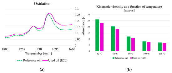 (a) Spectrum of the reference and used oil in the oxidation range according to [12]. (b) Kinematic viscosity of the reference and used oil at the temperatures determined by Design of Experiments methodology.
