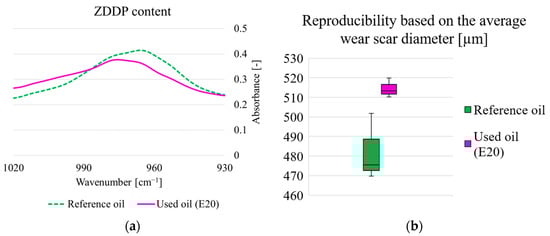 At all temperatures tested, the used oil contaminated with E20 fuel showed a lower viscosity than the reference. The difference in viscosity seems to be reduced around 80 °C, due to the evaporation of ethanol at 78.9 °C. This suggests that while, at low temperatures, the viscosity-modifying property of ethanol is significant, at higher temperatures, the effect on the boundary layer becomes more prominent [5]. As shown by Costa et al. [5] and Lenauer et al. [8], the reduction in the anti-wear additive content is also a possible consequence of ethanol on the boundary layer. However, this study could not demonstrate the phenomenon due to lack of appropriate methodology, as FTIR is not suitable for the detection of reaction products. On the other hand, FTIR spectroscopy indicated a slight decrease in ZDDP content in the used oil (Figure 3), thus indicating a minor amount of depletion. Based on the results of the oil analysis, it can be assumed that the difference between the coefficient of friction and the average wear coefficient of the reference oil and the oil used is due to the presence of E20 fuel.