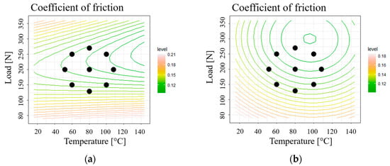 (a) Reference-oil model based on coefficients of friction (the measurement points used to construct the model are shown as black dots). (b) E20 contaminated used oil model based on coefficients of friction.