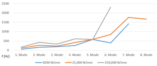 While the existing literature provides valuable insights into turbocharger rotordynamics, a gap exists in research specifically investigating the influence of rotor, bearing, and lubricant parameter modifications on Campbell diagrams and their corresponding vibration modes. In a study by B. Schweizer [4], the influence of floating bearing ring spring stiffness on gyroscopic mode shapes was investigated for stiffnesses of 3000, 15,000, and 150,000 N/mm. The initial value of 3000 N/mm was determined through simulations relating mean bearing forces to mean shaft displacements during run-up. Figure 1 summarizes the results. As expected, natural frequencies generally increase with higher bearing stiffnesses, except for the fifth mode, which is identified as torsional. Interestingly, every second mode up to the fifth exhibits a more significant frequency increase. This phenomenon could be attributed to the presence of reverse and forward pair modes. These mode pairs, such as conical or translational modes, typically originate from the same natural frequency at zero rotor speed (0 rpm). As the speed increases, they diverge in a V-shape, with the reverse mode decreasing in frequency and the forward mode increasing. Motivated by these observations, this article aims to explore and summarize the specific impact of various influencing factors on the natural frequencies of the investigated rotor.