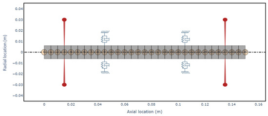 While the ROSS library offers a variety of application tutorials, a dedicated turbocharger model was not included. Therefore, this article leverages a rotor model from the COMSOL Multiphysics’ Application Gallery, titled “Turbocharger Supported on Floating Ring Bearings” [6]. The model consists of a turbocharger rotor supported by two floating ring bearings, one located near the compressor and the other near the turbine, with both the compressor and turbine overhung on the shaft. This configuration, which includes a beam rotor and floating ring bearings implemented through multiphysics couplings, aligns closely with our institute’s research objectives on rotor-bearing-lubricant interactions. The model was created with multiplied nodes, defining 30 nodes on the rotor to provide opportunities for changing bearing positions with high flexibility. The Python script defined material and rotor properties in list format, along with shaft, bearing, and disk elements. Compressor and turbine wheels were modeled as disks with specified mass, inertia values, and their positions on the shaft. To simulate the hydrodynamic journal bearing, ROSS utilizes the “BearingFluidFlow” element, which generates frequency-dependent coefficients for each analyzed frequency value. Finally, the script assembled the shaft, disks, and bearing elements, and the resulting model is presented in Figure 2.