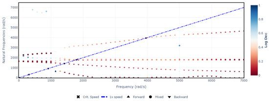 With all rotor parameters defined in the model, the Campbell diagram can be generated. Figure 3 illustrates the Campbell diagram for the initial model. The horizontal axis (x-axis) represents the rotational speed in radians per second (rad/s), while the vertical axis (y-axis) shows the calculated natural frequencies, also in rad/s. The first-order frequency is depicted by a blue dot-dashed line. Wherever this line intersects a natural frequency curve, a critical speed marker is indicated.
