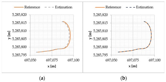 Figure 1. Position estimation results in normal conditions: (a) estimation result with EKF and without GNSS; (b) estimation result with EKF and GNSS.