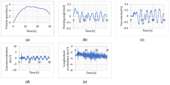 Figure 2. Measured sensor signals with misplaced IMU: (a) vehicle speed; (b) steering angle; (c) yaw rate; (d) lateral acceleration; (e) longitudinal acceleration.