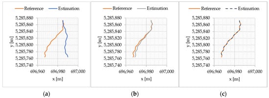 Figure 3. Position estimation results with misplaced IMU: (a) model-based estimation without EKF and GNSS; (b) estimation with EKF and without GNSS; (c) estimation with EKF and GNSS.