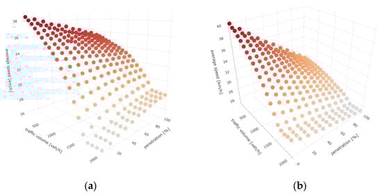 - Under medium traffic flow conditions (1200–1700 veh/h), as traffic volume increases further, average speed further decreases; however, as the MPR increases, it can slightly compensate for the loss in average speed by increasing it (Figure 2a).