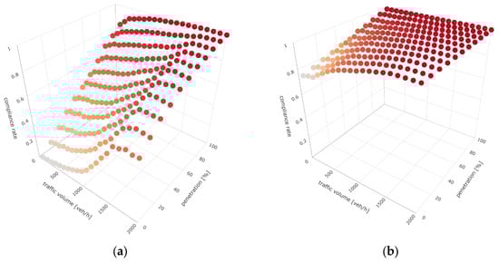 Compliance rate vs. traffic volume and MPR: (a) Segment 2 (30 km/h speed limit) and (b) Segment 1 (50 km/h speed limit).