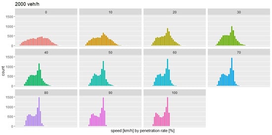 The speed distributions of the real-life measurements of the three sections were used as input for the simulation in PTV Vissim. Different market penetration rates (MPR) and traffic volumes were used in the simulation. MPRs ranged from 0 to 100 with an incremental increase of 10% (11 categories); traffic volumes ranged from 100 to 2000 veh/h with an incremental increase of 100 veh/h (20 categories). This resulted in a matrix of 220 cells. For each cell, 5 model runs with different random seeds were run. Each run lasted 1 h, resulting in a total of 1100 h of simulation. In the simulation, a 15 min warming period was used.