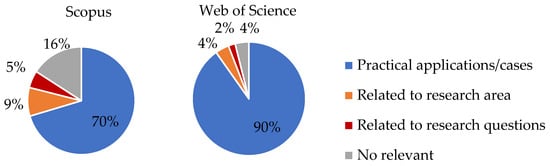 The red sector has the smallest occupation of articles in Scopus and WoS. Nevertheless, these papers are of the highest quality and are closest to the author’s research aim, fulfilling the RQs. The author categorized them into three colors corresponding to three research areas: blue for practical applications, orange for demonstrating the expected outcomes (O) in the PEO framework, and red for directly answering the RQs.