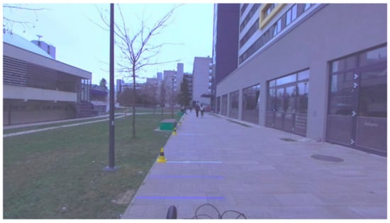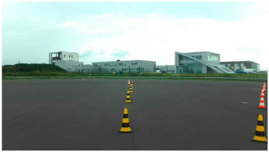 We measured the true distance from the ground directly under the camera to the selected distances marked with traffic cones and marker tapes. In the first experiment, the tapes were one meter apart and the traffic cones were five meters apart. In Figure 1, the starting tape closest to the vehicle was 3 m away, the first cone was 5 m away, and then the rest of the markings followed the rule defined above. This experiment only measured inaccuracies in the middle of the camera image with a lens focal length of 2.1 mm.