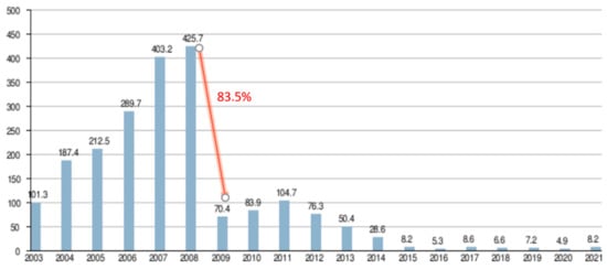 Ukraine has expanded its free trade area with the EU, Canada, and several other countries since it became a member of the WTO in 2008. By becoming a full member of the WTO, Ukraine received additional rights to apply measures for the protection of the internal market. However, in relation to the domestic automobile industry, these rights were not fully exercised. Preferences for Ukrainian automakers were abolished and the rate of import duty on imported cars was reduced by 2.5 times. That was resulting in a completely opened market for the import of foreign cars, the share of which sharply increased from 50 to 89%. The automobile complex of Ukraine wasn’t ready to compete effectively with foreign automobile concerns. Coincidentally, it happened when Ukraine’s economy was negatively affected by the global financial crisis. As a result, in 2009 the volume of car production in Ukraine decreased by 83.6% (Figure 1). That was the most significant decrease in car production in the world [4].