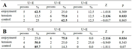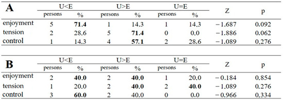 Free practice (A) and timed practice (B)—before and after enjoyment, tension, and control (pooled sample, non-parametric test, Wilcoxon test). Abbreviations: (U < E) = before free practice; (U > E) = after free practice; (U = E) = before free practice, after free practice.