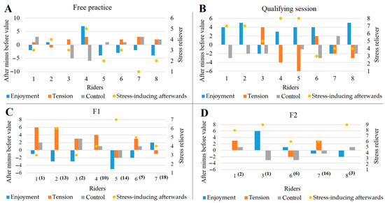 On the left y-axis (Figure 3A), the difference between the scores for the activity named in the title gives the scaling. That is, the score after the named activity is subtracted from the score before it. Thus, (1) minus means that after scores lower than before, (2) positive means after scores higher than before, or where this does not appear, and (3) before = after. According to these results, enjoyment as a psychological element increased during free practice for only two of the eight riders interviewed. The tension increased for all but one rider. Control showed a similar pattern as tension, with a negative post-stress element in all but two riders and a significant decrease in three cases. On the x-axis, the numbers in the brackets show the free practice (Figure 3C) and the qualifying session (Figure 3D) rankings. The ranking of the competitors and the examined psychological characteristics neither confirm nor contradict the results obtained.