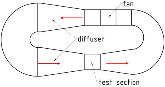 The use of a wind tunnel is one of the most traditional ways to examine a vehicle’s aerodynamic parameters [17]. The basis of this method is using an open tunnel in which the examined vehicle is placed (Figure 1). Air is circulated in the tunnel by a fan. Flow parameters can be precisely set and modified during measurements. Therefore, wind tunnel measurement data are widely accepted and valid if the measurement report meets certain criteria.