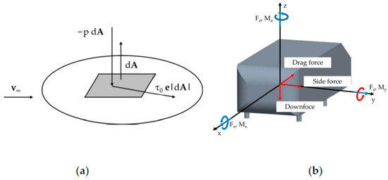 To describe how a vehicle operates in different driving conditions from an aerodynamic point of view, it is important to examine the aerodynamic force acting upon it. This force consists of two parts: pressure differences and shear stress [20]. If these forces act on a unit area (Figure 3a), the aerodynamic force can be calculated as follows:
