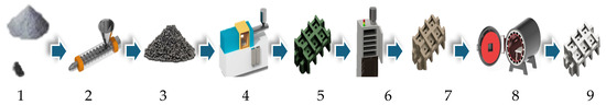 Research into the technology used for metal injection molding is currently not very intensive, although the application of the process is currently spreading in industry.Despite this, the components produced in this way are part of everyday machines and equipment, such as turbo vanes in the charging systems of motor vehicles, medical devices, dental devices or parts of defense industry products [1]. In addition, in small household appliances, we can also find components produced in this way. The main advantage of the technology is that it can be produced in large series using practically any alloy with a complicated shape. The name can be a bit misleading; in reality, the process is a series of complex technological steps consisting of a combination of two processes: injection molding and powder metallurgy [2,3]. The main steps of the procedure are shown in Figure 1.