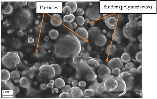 In order to make the injection molding materials more studiable and perceptible, the electron microscopic images taken of them are presented. Figure 2 shows the injection-molded product, which still contains a large amount of binder. It is important to mention that the recordings always come from the broken surface of the specimen.
