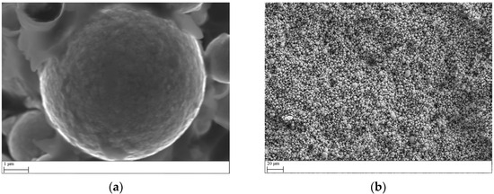 According to the literature research, the test was used to determine the amount of oxide on the fracture surface of the injection-molded product. The processing temperature of the melt took place at 220 °C, which to a small extent promoted the oxidation of the surface of the grains, since the alloy was not corrosion-resistant. The examination was carried out in two ways: first by scanning a larger area, where the results of approximately 10–15 thousand particles were detected, and then at a much higher magnification, where the surface of approximately one particle is evaluated. Based on the images taken with the SEM BSD Detector shown in Figure 3, the examined surface is clearly visible.