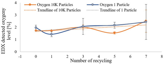 The results from both the measurements involving many particles and those focusing on individual particles were consistent, showing similar increases in oxygen levels. Although the exact residence time was not measured, the observed increases in oxygen content supported the assumption that repeated reprocessing led to a longer residence time of the material in the chamber, which likely contributed to the growth of the oxide layer on the particle surfaces. Figure 4 presents the measurement results along with the corresponding standard deviations. The diagram shows that the oxygen content remained relatively stable as the number of generations increased, but it began to rise after the fifth generation. It also indicates that the oxygen content measured on larger particles provided more consistent results, with a smaller standard deviation.