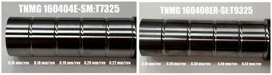 Before the experiments, preliminary tests were performed on DIN-C45 carbon steel. A specimen with a 50 mm diameter and 400 mm long was machined on both ends with the first two inserts from Table 1, suited for steel machining with five different technologies. All the technology parameters were chosen from the middle of the producer-offered range, except for the feed during the test. As for the feed, the authors chose one from 0.02 mm/rev below the optimal range and one from 0.02 mm/rev above the range. The rest of the selected feeds were from the application window’s low, middle, and high parts for the selected tools after all the machining. The cutting parameters of the two different cutting inserts are summarized in Table 2.