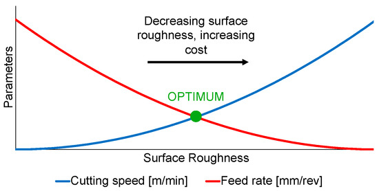This method would make it possible to optimize the cutting method and include other economic factors like the hourly rate of the machining, the consumed power, or the cycle time of the workpieces. Considering all the economic factors mentioned, it would also be possible to optimize the machining process cost and carbon footprint [17] (see Figure 2).