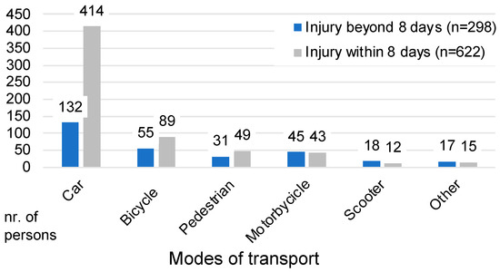 The severity of injuries by mode is depicted in Figure 1, which indicates that a larger proportion of serious injuries taking more than 8 days to heal were sustained by unprotected road users. This category comprised 24% of car occupants, 38% of cyclists, 39% of pedestrians, 51% of motorcyclists, 60% of e-scooter users, and 53% of individuals injured in other vehicles.