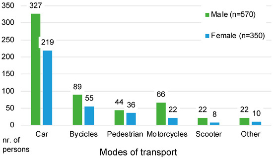 In the emergency department, 570 men (62%) and 350 women (38%) received treatment. Figure 2 shows the number of men and women injured by different modes of transport.