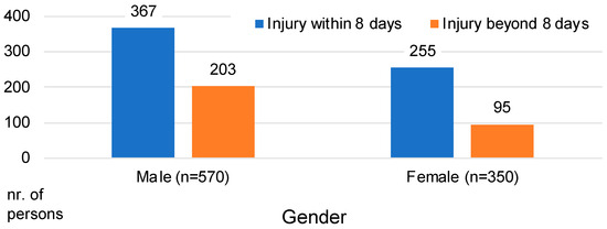 In terms of the severity of the injuries suffered, 35% of men and 27% of women in our sample had a serious injury that healed in more than 8 days (Figure 3).