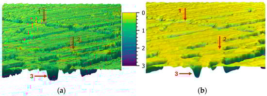 Exemplary surface scan of cylinder’s running surface showing (a) topography before digital filtering (virtual running-in) and (b) topography after digital filtering. Red arrows highlight surface features, which were smoothed during virtual running-in: protruding asperities (1,2) are removed, while valleys (3) are rounded, which resembles naturally occurring phenomena due to wear (1,2) and accumulation of wear debris (3).