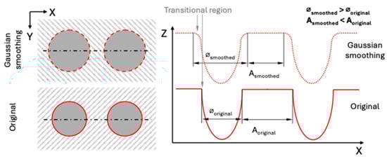 A visual description of the effect of Gaussian smoothing, showing a stylized dimpled surface from a topside view and in a cross-section profile. As the transitional region between the plateau (hatched) and the dimple (dark gray) is rounded during smoothing, the dimple diameter increases (⌀smoothed > ⌀original) and the total plateau area decreases (Asmoothed < Aoriginal).
