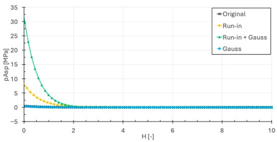 The scanned and virtually textured (original) surfaces show a very shallow curve, which can be attributed to the surfaces having local protruding asperities. These exhibit elevated contact pressure, but due to their localized nature and discrete number, contribute little to the mean asperity contact pressure. Since Gaussian smoothing only affects the edges of dimples, the effect of this procedure alone is negligible. Applying digital filtering (virtual running-in) has a pronounced effect on mean asperity contact pressure, as this process removes local asperity peaks and significantly flattens the surfaces, resulting in a smoother contact surface. As H decreases, the flattened surfaces form a larger real contact area, which contributes to a rising pAsp value. Using both filtering and Gaussian smoothing results in an even faster rise in pAsp with decreasing H. This is theorized to be a result of the reduction in the overall real contact area, as Gaussian smoothing rounds the edges of dimples, which is depicted in Figure 2. Reducing the real contact area of the virtually run-in, flattened surface results in higher contact pressure at the same nominal separation. As these findings agree with basic physical phenomena, i.e., decreasing the number of outlier asperities and decreasing the real contact area leads to an increase in mean asperity contact pressure, the procedure including both virtual running-in (digital filtering) and Gaussian smoothing will be utilized for further investigations.