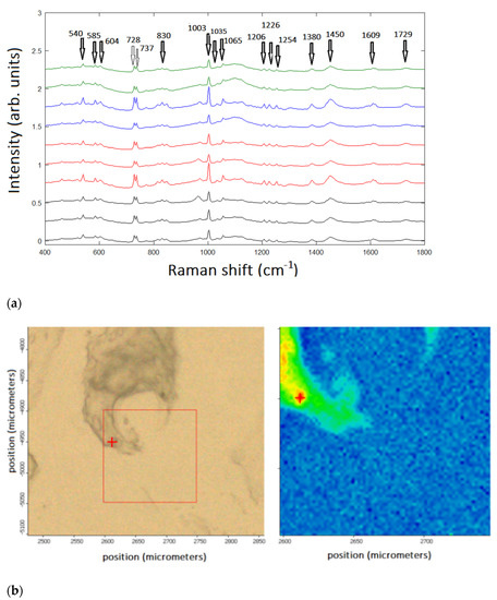 RS analyses of cancer tissues generate a great number of datasets where the pathologists must discriminate between tissues, their degrees of malignancy, and between biocomponents inside any tissues, such as cells, the extracellular matrix (ECM), and others. This differentiation must rely on RS signals that include single spectra (Figure 1a) or images (Figure 1b). Therefore, a multivariate analysis based on sophisticated statistical methods is mandatory when grading the tissues and performing a diagnosis with the highest accuracy.