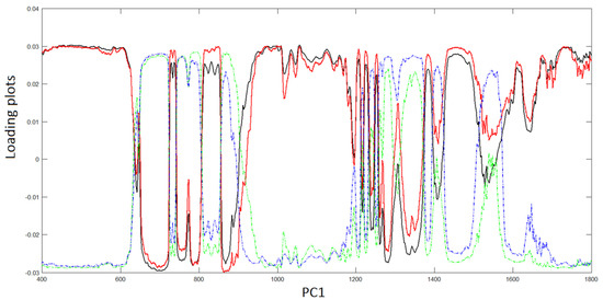 Loading plots of PC1 for the various CS grades: EC, black line; CS GI, red line; Cs GII, blue line; CS GIII, green line.