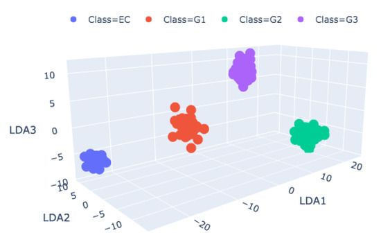 Currently, one limitation of our study is the narrow number of patients, which frames our study as a pilot study. However, the supervised method based on PCA+LDA algorithms is highly scalable and can not only be applied to larger datasets, but also to any type of cancer tissue. Our main interest is to replicate this study for melanoma. Skin cancer is one of the most common cancers in humans and its incidence is increasing dramatically [2,3]. Diagnosing malignant skin tumors is difficult as many common benign skin lesions visually resemble them, e.g., pigmented nevi and seborrheic keratosis. Currently, trained dermatologists clinically diagnose melanoma correctly in 63%–75% of cases. We are confident that we can improve these results using of our multivariate analysis.