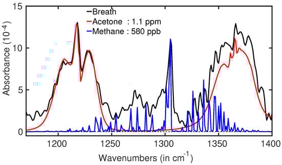 A large population in modern society suffers from metabolic disorder, commonly called diabetes. It is characterized by a high blood sugar level over a prolonged period of time. It is well known from ancient times that the breath of diabetic patients smells sweet due to acetone in their biofluids. Indeed, it has been found that the acetone level in the breath of diabetic patients is significantly elevated [14]. We have shown that infrared spectroscopy is capable of detecting and quantifying acetone in breath samples [13]. In experiments, it can be identified unambiguously by two broad peaks centered at 1217 cm−1 and 1365 cm−1, shown in Figure 1. A fitting curve for acetone is represented by the red line along with the breath spectrum (black) of a healthy volunteer. The measured corresponding concentration of acetone is ∼1.1 ppm. According to the literature, the concentration of acetone for patients suffering from type 1 diabetes ranges between 1.5 ppm and 2.2 ppm. Monitoring the diabetic stage via acetone can be considered as a noninvasive, fast procedure.