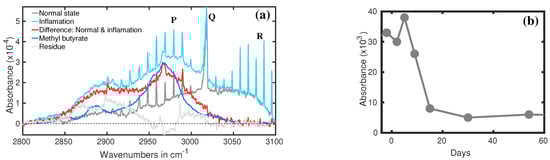 (a) Infrared spectra of breath: healthy volunteer (gray) and with bacterial infection (cyan). The red curve is the spectral difference between the above two spectra. The blue plot is the IR spectrum of methyl butyrate. (b) The recovery dynamics of acute gastritis via the quadruple course (QAC) [16].