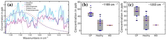 (a) The average absorption spectra of healthy (red) and CP (blue) volunteers. Dashed lines: fitting curves of three main VOC candidates; (b,c) plot boxes for healthy, CP, and a patient with muscular dystrophy (MD), with the corresponding median values and error bars [19].