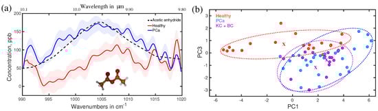 (a) The average absorption spectra of healthy (red) and PCa (blue) volunteers. Dashed line: fitting curves of acetic anhydride, identified as a biomarker. (b) The result of the principal component analysis. Ellipses are drawn for the visualization of the three groups [21].