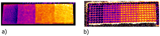 Successful coating inspection can also be performed by means of active thermography, as described in, e.g., [1,2,3]. One of the most-used techniques is flash pulse thermography. The technique is based on specimen excitation by a short pulse (few ms) with a high-power flash lamp and the recording of temperature response by an infrared camera. The response can show changes in heat transfer connected to variations in coating thickness. The detection of coating thickness variations using flash pulse thermography was, for example, reported in [4,5,6]. Thickness inspection was mostly performed via the application of fast Fourier transform. A suitable phasegram (result of FFT-phase) showed differences in coating thickness. In studies [1,7], the result was transformed from phasegram form to thickness maps via calibration. A similar approach was described in [2] where, instead of FFT, a time transformation method was used, which provided slightly better results