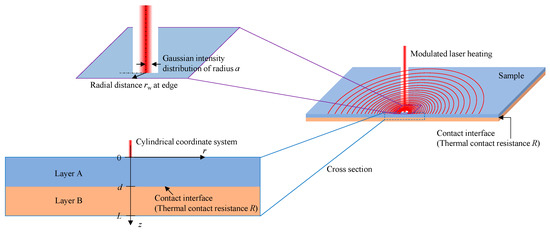The measurement method was carried out using the two layers system, consisting of two thin plates, A and B, that have TCR at their interface, as shown in Figure 1. When a point distant from the edge of the A layer surface is heated periodically by a laser focused on a spot, the temperature response is expressed as the following [4]: