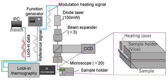 The measurement apparatus is shown in Figure 3. It is based on a sample surface spot heating−side surface detecting system in microscale using IR microscope, which has a spatial resolution of 2.5 μm. A sample was made by bonding and laminating two isotropic graphite IG-110 plates (thickness is 0.480 mm). The total thickness of the prepared sample was 0.965 mm. The thermal conductivity and the thermal diffusivity of IG-110 are 126 W/(m·K) and 102 mm2/s [5]. The measurements were conducted in the conditions of 1.0 Hz. The frame rate of LIT was 99 Hz. The measurement was conducted at room temperature under atmospheric pressure. Heating points were located for the three points of 500 μm pitch along the sample edge to assess the validity of the distribution analysis.