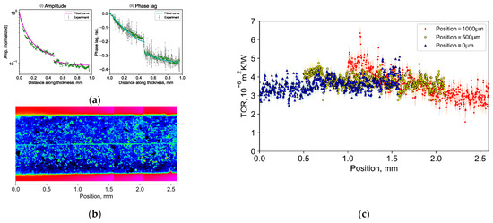 Figure 4 shows the TCR measurement result: (a) TCR fitting result for a typical analysis position [4]; (b) IR image of the sample side surface; (c) distribution analysis result. Figure 4a shows the extracted measurement plots and the fitted theoretical curves with error bars showing the standard error rate: ((i) amplitude, (ii) phase lag). The fitting analysis was conducted using the least square method for both the amplitude and phase lag plots. The theoretical curve and experimental plots show a good level of agreement. Thus, the obtained TCR values were (2.7 ± 1.5) × 10−6 m2K/W. This result was inferred to provide reasonable values because both were similar to the measurement results of Feng et al. who measured the averaged TCR of a whole contact interface, using the FDTR method with a silicon–silicon contact interface bonded with thermal grease [6]. While the amplitude plots have a smaller standard error rate, TCR is more sensitive to amplitude. Therefore, both the amplitude and phase lag, not only the amplitude, were used for the fitting analysis.