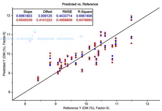 Calibration (blue) and cross-validation (red) results for the prediction of dry matter content in Habanero chilli using NIR spectroscopy.