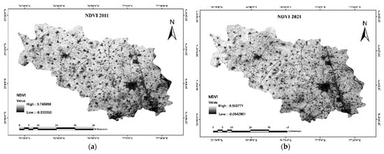 Mean NDVI values (a) NDVI image 2011; (b) NDVI image 2021.