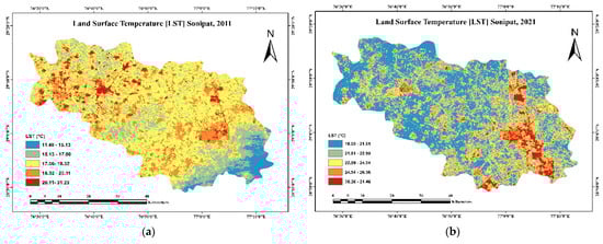 Mean LST values (a) LST image 2011; (b) LST image 2021.