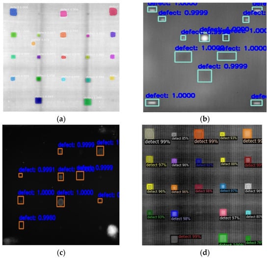 The segmentation results in this work include the algorithm from several types, such as the objective detection YOLO-V3, as shown in Figure 1b,c, and instance segmentation detection algorithm Mask-RCNN as indicated in Figure 1a,d. These results have shown validation results from the training of the state-of-the-art deep learning algorithms.